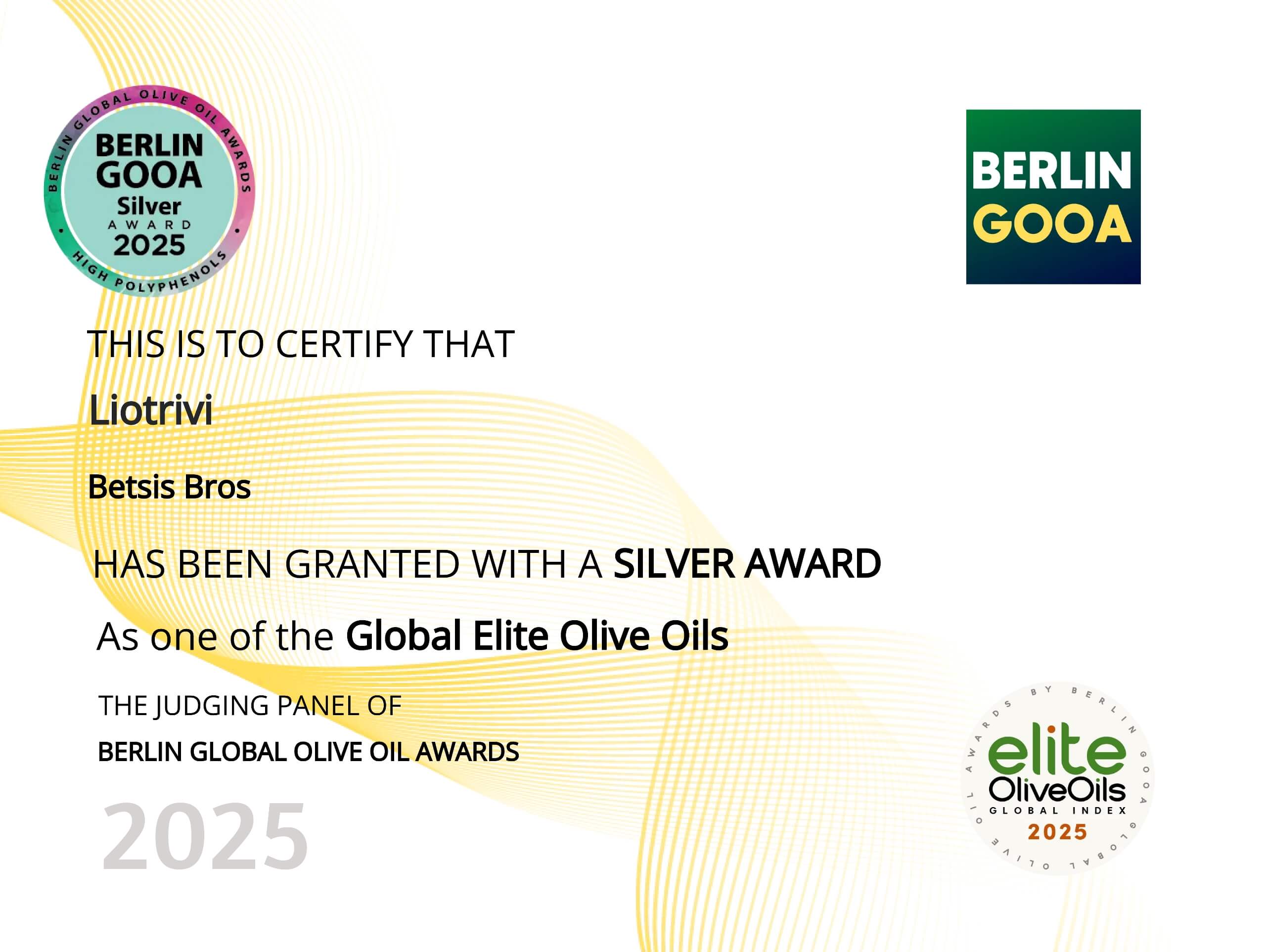 We proudly produce exceptional quality extra virgin olive oil from the renowned Koroneiki variety, known for its rich flavor profile and naturally high polyphenol content. Our dedication to quality and craftsmanship has been internationally recognized, earning us two Silver Olive Oil Awards at the Berlin Global Olive Oil Exhibition in Germany—one for high polyphenol content and another for outstanding taste.